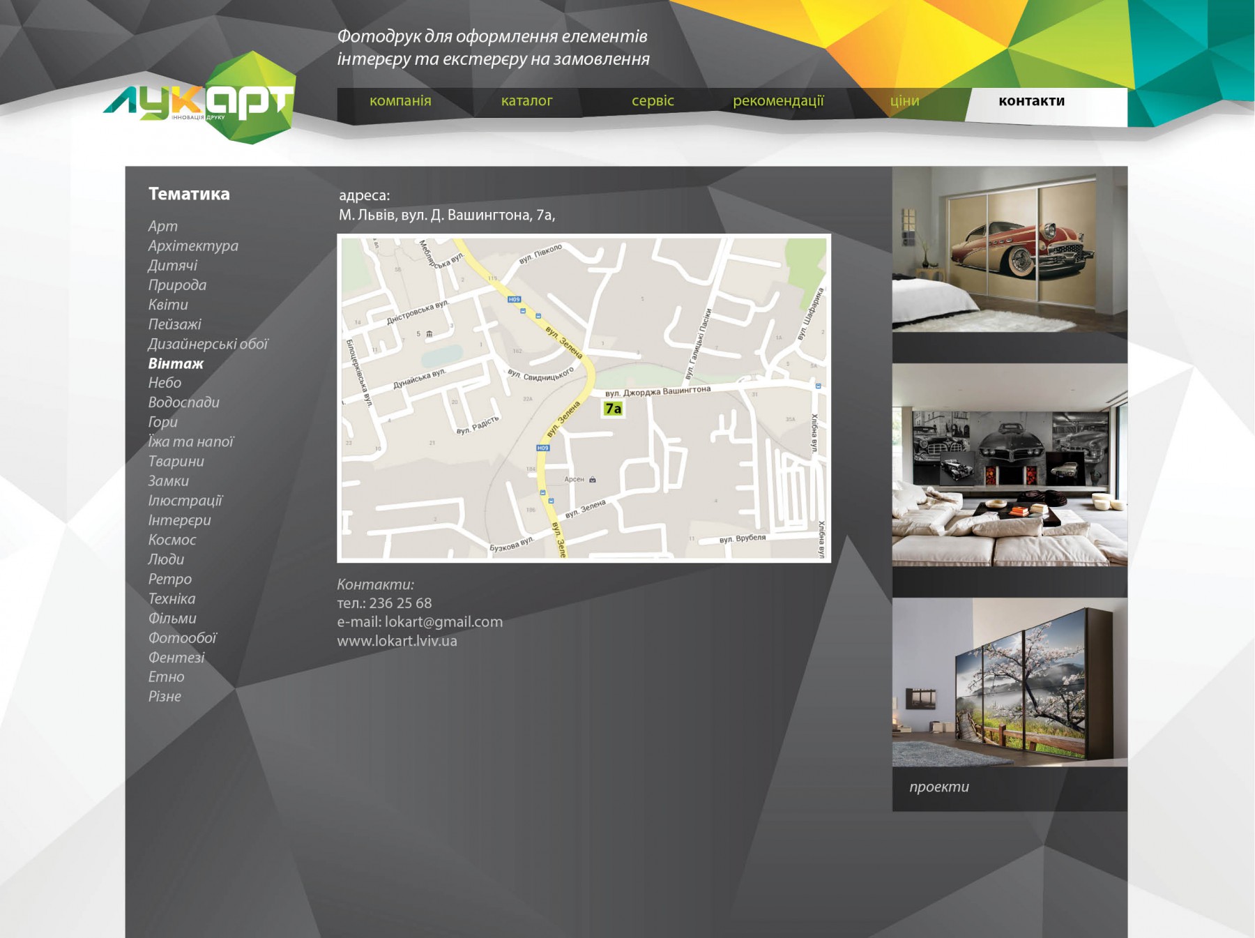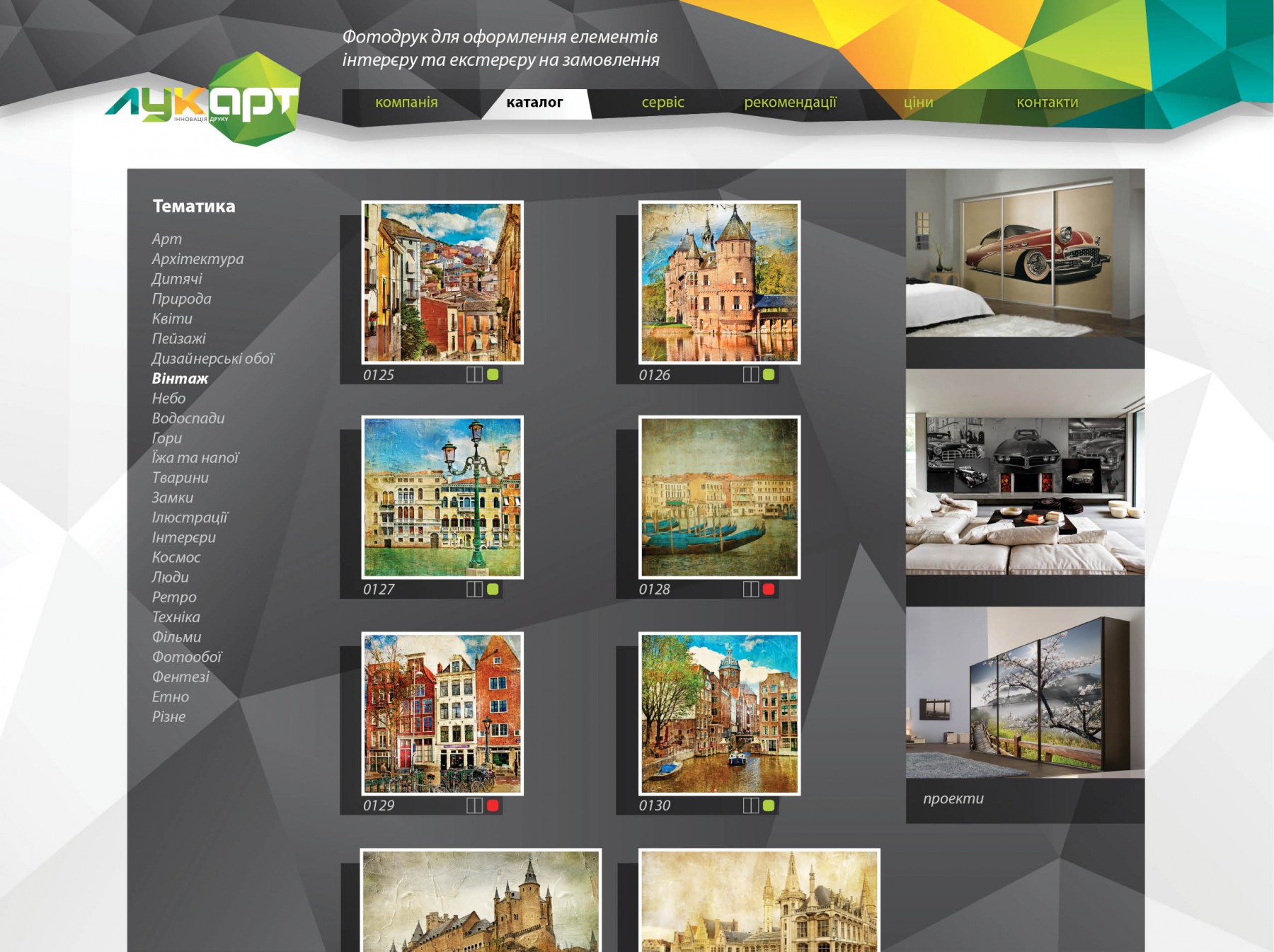 Develop business site for LookArt with modern design, which manufactures interior elements using printing.